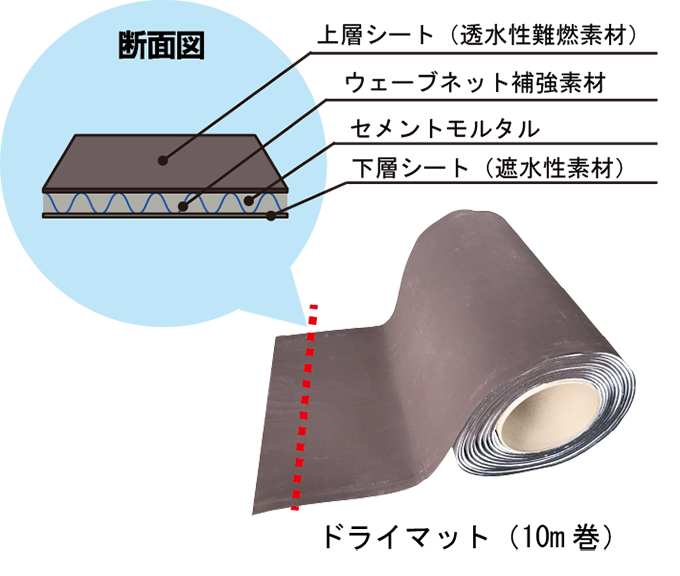 ドライマット内には、セメントモルタル(セメントと微細な細骨材)が含まれており、水をかけると水和反応によってセメント粒子となり、時間と共にウェーブネットと共に結びつき、凝結、硬化していきます。